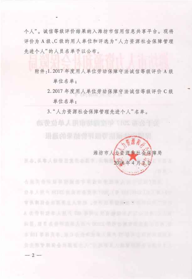 经市人力资源社会保障局审核认定,山东中凯兴业贸易广场有限公司被评为“2017年度劳动保障守法诚信A级单位”,公司人力资源部张荣芳被评选为“人力资源社会保障管理先进个人”。
